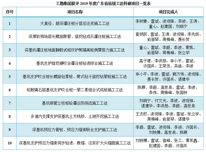 2019年12月12日,2019年度廣東省工程建設(shè)省級工法名單出爐,工勘集團共10項科技研發(fā)項目榜上有名。本年度省級工法由廣東省住房和城鄉(xiāng)建設(shè)廳組織專家評審,共受理申報項目1400項,其中696項通過審定并予以公布。
